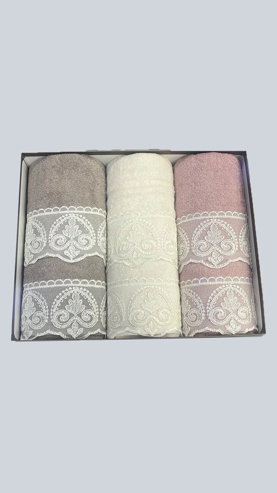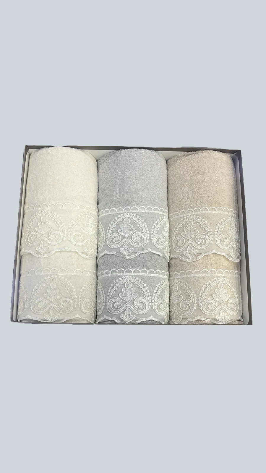 La confezione comprende 3 asciugamani viso e 3 asciugamani ospite, disponibili in 3 colorazioni miste, presentati in una scatola elegante, perfetta anche come idea regalo.
