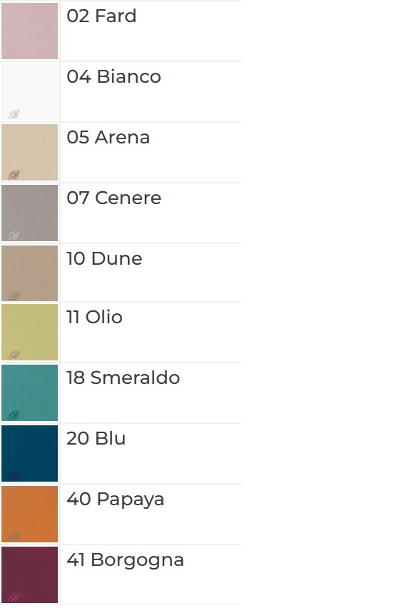 | Colore | 02 Fard, 04 BIANCO, 05 ARENA, 07 CENERE, 10 DUNE, 11 OLIO, 18 SMERALDO, 20 BLU, 40 PAPAYA, 41 BORGOGNA |