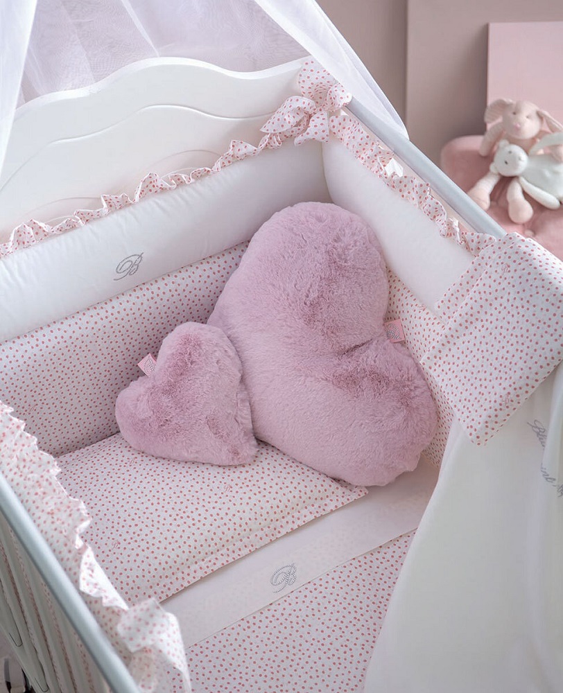 Completo copripiumino per lettino stampato su percalle di cotone con logo Blumarine in cristalli. Set 5 pezzi formato da: paracolpi lettino 205×45 cm in percalle tinta unita stampato con logo in cristalli, retro completamente stampato, imbottitura da 550 g/mq sacca 120×150 cm: parte superiore stampata su percalle, con fascia tinta unita e logo in cristalli, […]