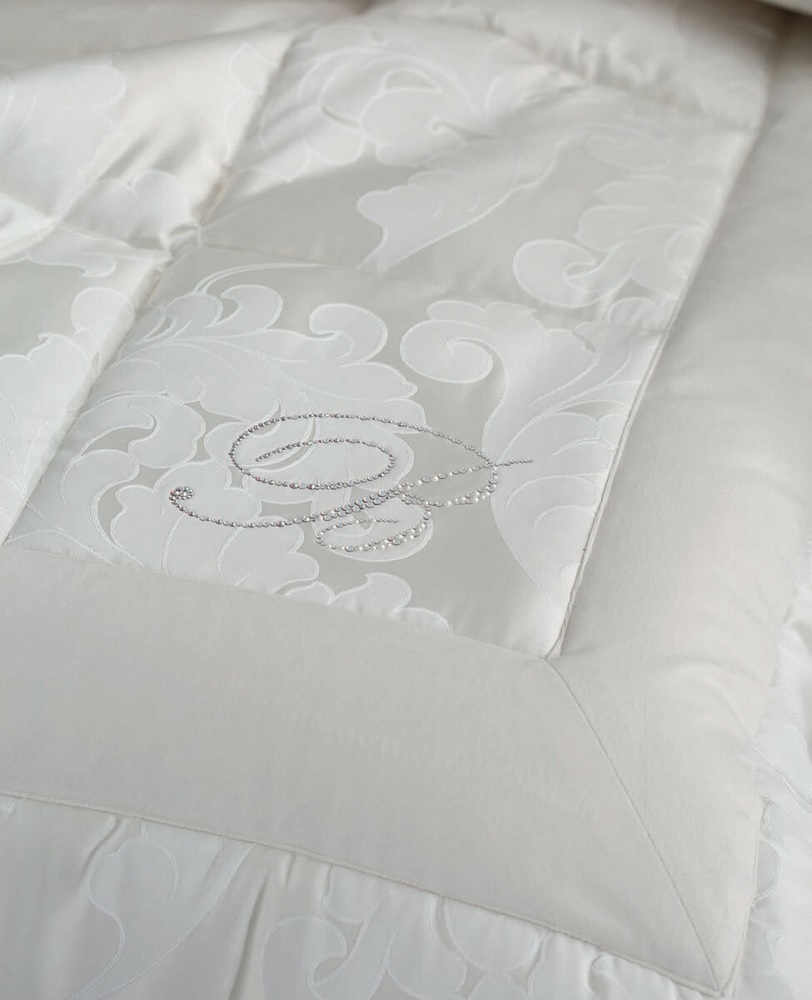 Trapunta matrimoniale costruita in jacquard con fasce in velluto rimesse in applicazione sul piano letto e in caduta su tre lati, logo Blumarine in cristalli.