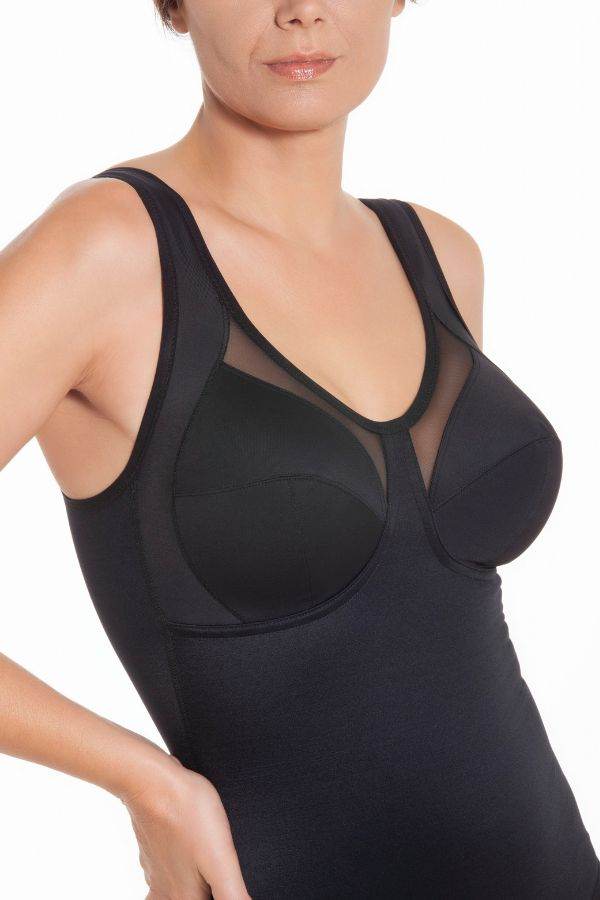 Realizzato con un tessuto di alta qualitร che contiene il 25% di lycra, Ariel garantisce un’azione altamente contenitiva su addome, fianchi e schiena, dando l’illusione visiva di una taglia in meno. L’interno del body รจ rivestito con un tessuto in raso mono elastico che si allunga in lunghezza ma non in larghezza, fornendo un supporto efficace senza restrizioni.