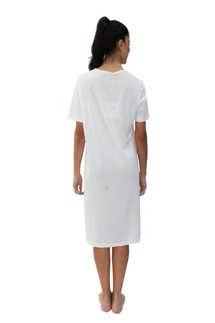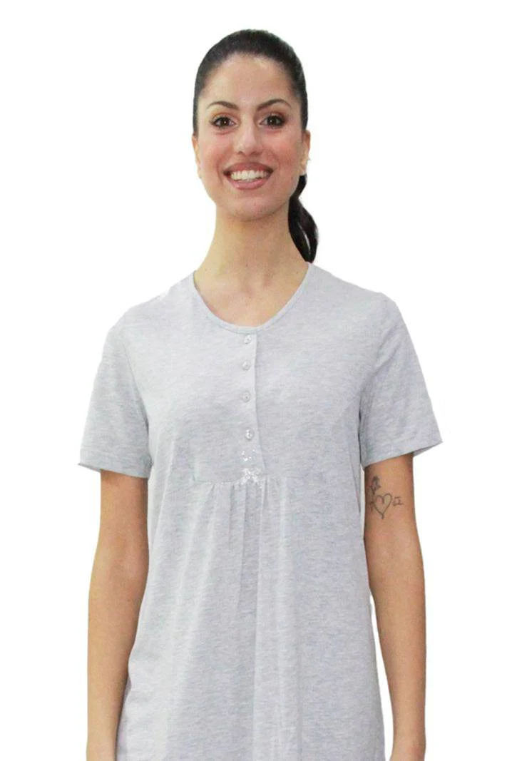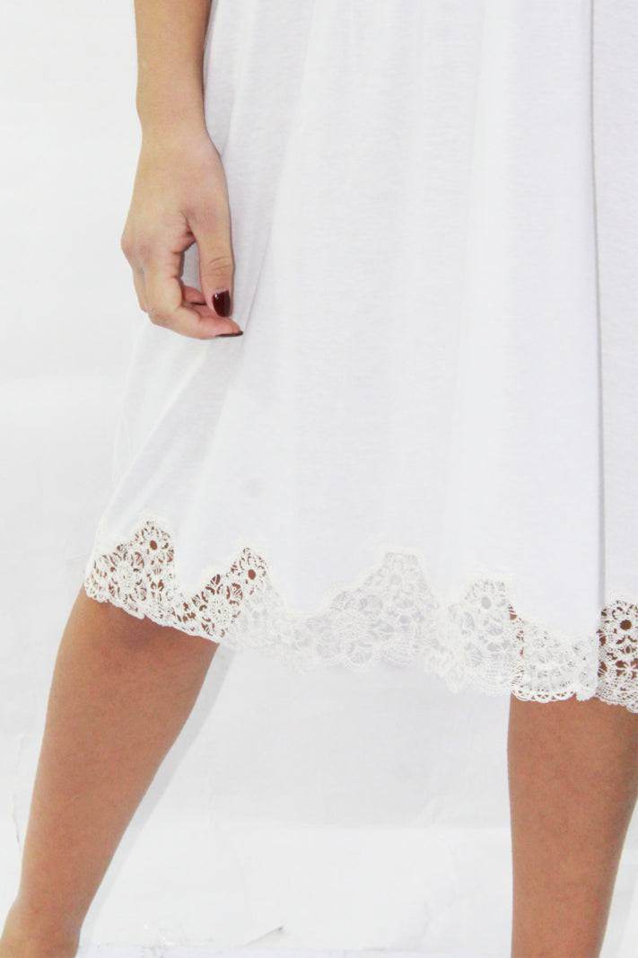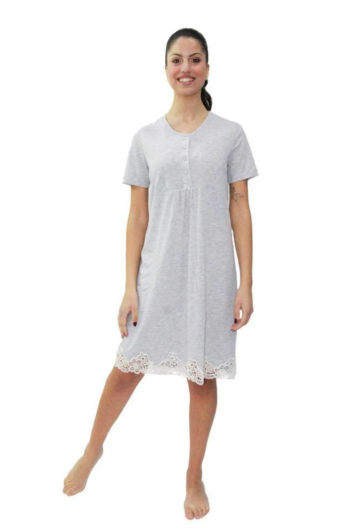Elegante Camicia da notte, in puro cotone con manica corta e abbottonatura serafino con taglio sottoseno. Balza applicato con pizzo.