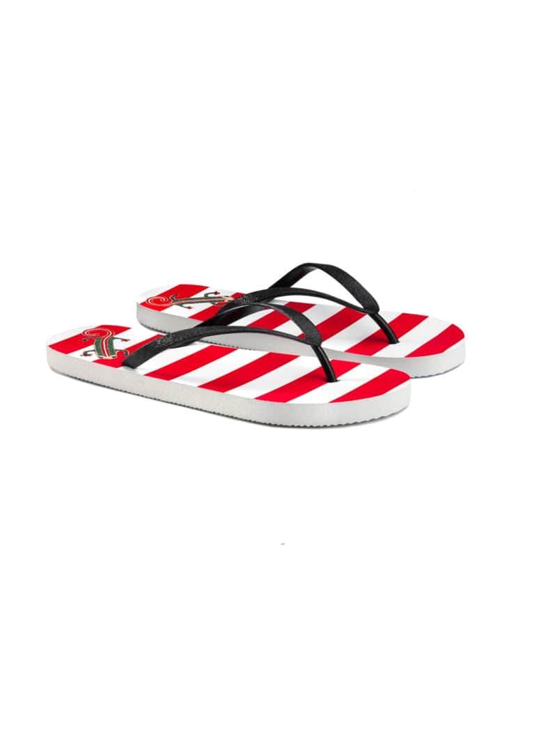 Infradito bassa con sfondo stampato a righe bianco e rosso impreziosita da una stampa con lucertola verde e rossa Fashion e versatile per garantirti il giusto comfort