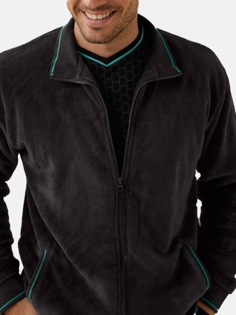 Pigiama in tre pezzi composto da pantaloni lunghi con polsini, maglietta in caldo cotone interlock a maniche lunghe, giacca con zip e tasche. Set da uomo a firma Promise, il modello H32993 รจ un completo notte ed homewear da uomo molto comodo.