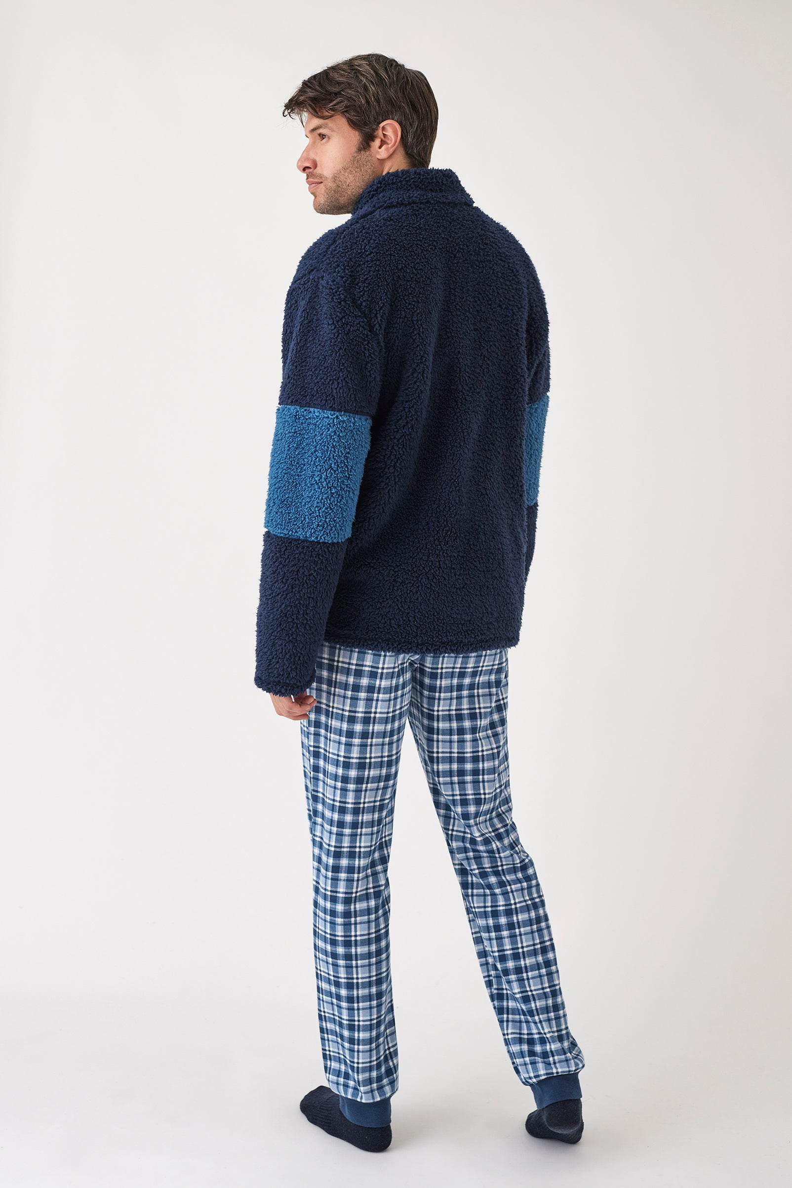 Comodo e caldo completo da uomo composto da pantalone lungo con polsini, maglia a maniche lunghe in interlock con perchado interno e giacca in tessuto coral (borreguito) con chiusura a zip. Ideale per il relax a casa o le serate piรน fresche.