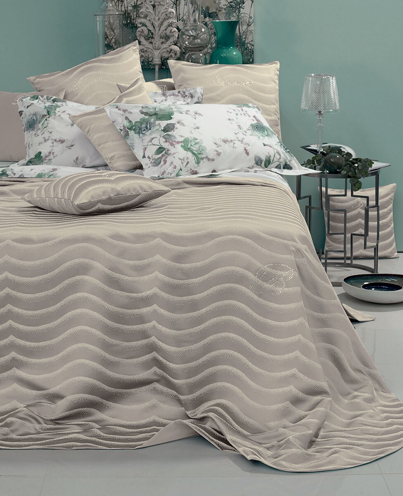 Copriletto matrimoniale liscio non trapuntato e non foderato, con sensuale motivo jacquard a onde e logo Blumarine in cristalli. Misure: 270×270 cm Tessuto: 100% poliestere Made in Italy