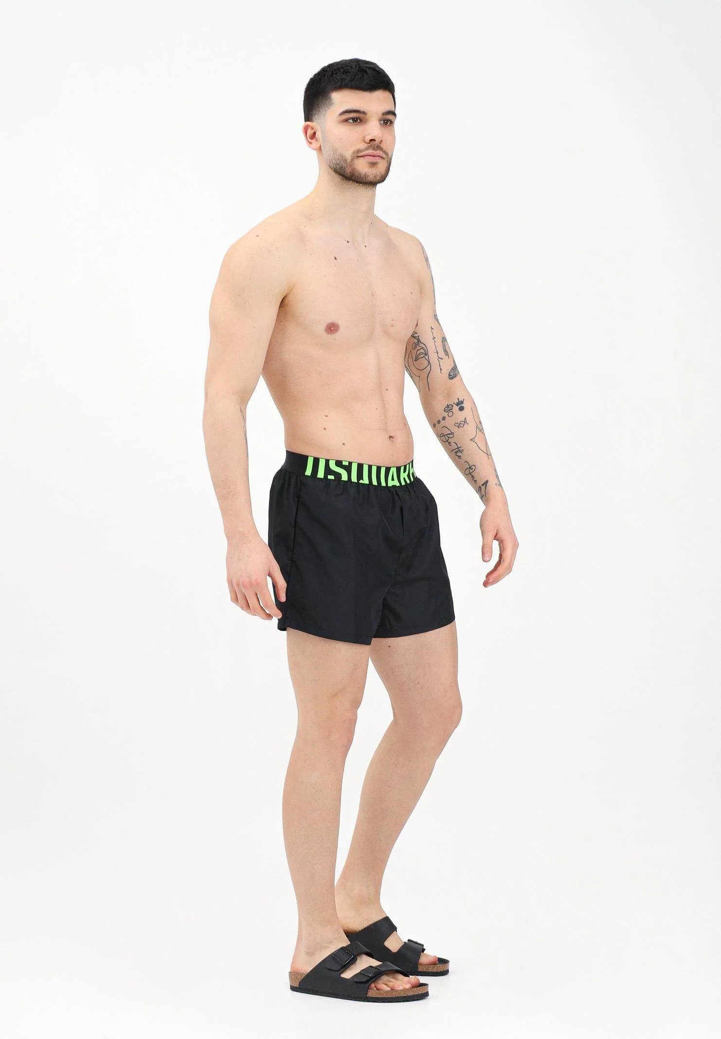 Disponibili in tinta unita nei colori nero o verde, sono caratterizzati da un elastico vistoso in vita che aggiunge un tocco di carattere al design. Vestibilitร comoda e regolabile, ideale per ogni occasione estiva.