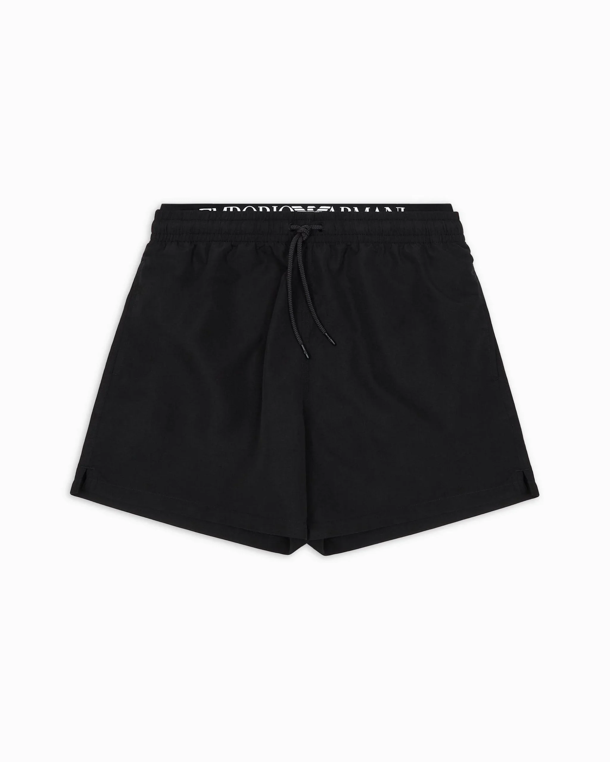 Costume boxer tinta unita con elastico interno. Costume modello shorts con coulisse e fascia elastica in vita, impreziosita dal logo frontale a lavorazione jacquard. Realizzato in poliestere riciclato certificato, supporta una produzione piรน sostenibile e a basso impatto ambientale. Il design essenziale e la vestibilitร confortevole lo rendono ideale per il relax in spiaggia o in piscina.