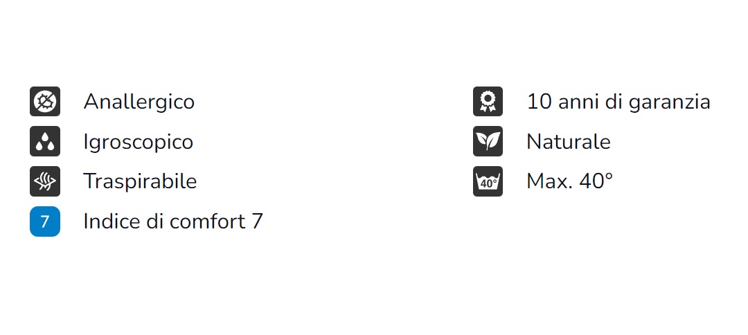 Tutte le misure, dal piumino letto singolo al piumino letto matrimoniale, sono caratterizzate da un elevato potere di riempimento che si traduce in elevato comfort: viene offerta un’esperienza di riposo rigenerante insieme ad una leggerezza estrema. L’esperienza del sonno รจ ulteriormente migliorata dalle ottime capacitร isolanti, traspiranti e termoregolanti di questo piumone letto che si adatta a qualunque stagione. Tutto ciรฒ si traduce in un miglioramento complessivo della qualitร della vita.