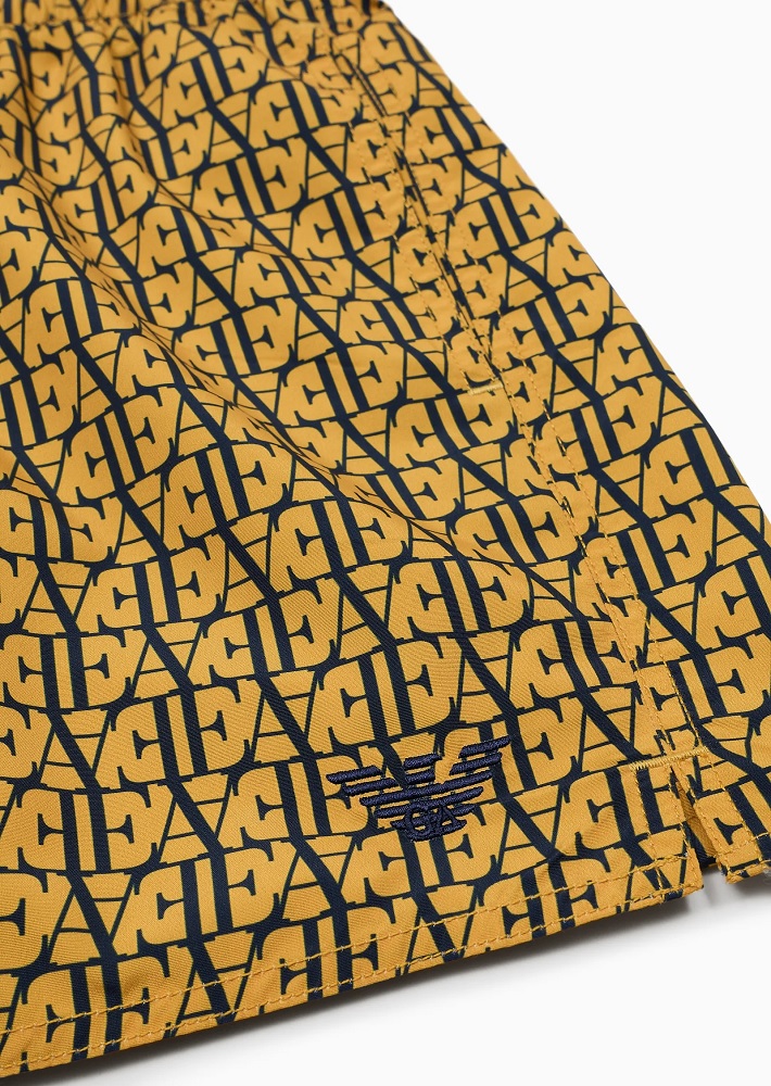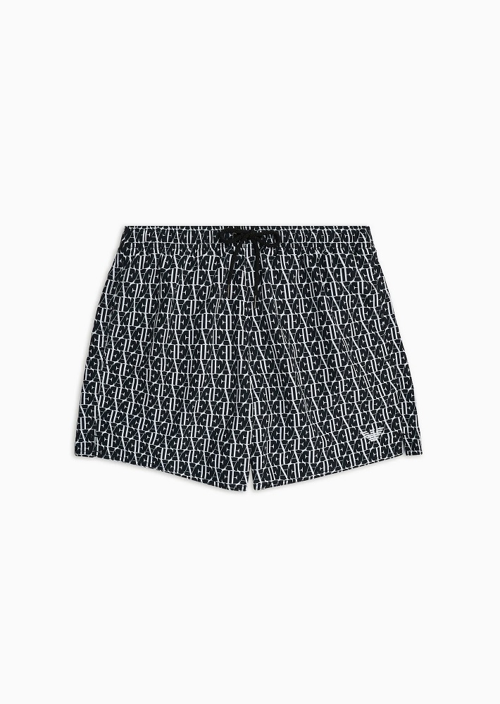 Costume modello shorts con coulisse in vita. Il tessuto water repellent รจ decorato da grafica con stampa logo all over.