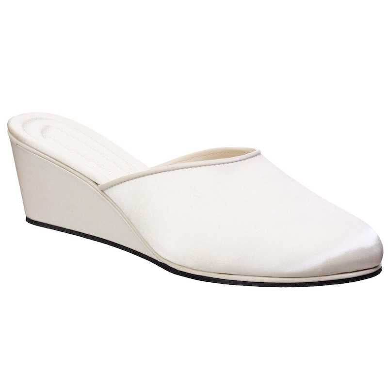 Pantofola chiusa da sposa in colore seta, caratterizzata da un design essenziale e raffinato. Realizzata con materiali di alta qualitร per un comfort superiore, รจ disponibile nelle taglie dalla 36 alla 41. Perfetta per completare l’outfit da sposa con eleganza e discrezione.