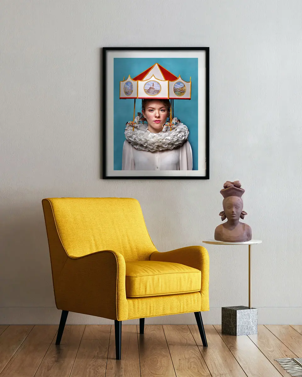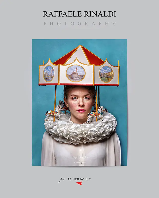 Raffaele Rinaldi Dieses Foto aus der Serie „Toys Beauty“ ist eine Hommage des Künstlers an die Stadt Florenz, in der er die Kunstakademie besuchte und mehrere Jahre lebte. Viele seiner Ideen entstanden tatsächlich auf den Bänken des großen Karussells auf der Piazza della Repubblica , wo er sich oft mit Freunden traf. Der große Hut mit den Pferden ist aus Sperrholz gefertigt, und wenn man die Vorderseite vergrößert, erkennt man, dass die Stadt Florenz darauf gemalt ist . „Ich habe immer meine Träume fotografiert, nicht die Realität.“