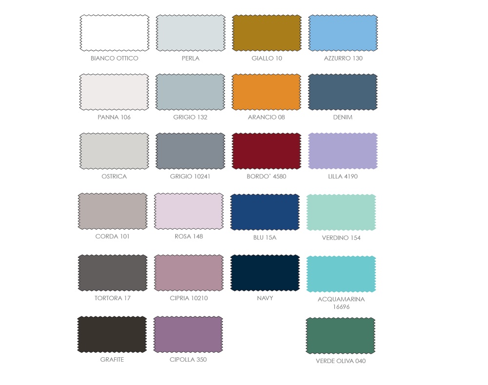| Colore | Acquamarina, ARANCIO 08, AZZURRO 130, BIANCO OTTICO, BLU 15A, BORDEAUX 4580, Bosco 801, CIPOLLA 350, CIPRIA 10210, CORDA 101, Grafite, GRIGIO 132, Ostrica, PANNA 106, Pavone 901, Perla, ROSA 148, TORTORA 17, VERDE 154, VERDE OLIVA 040 |