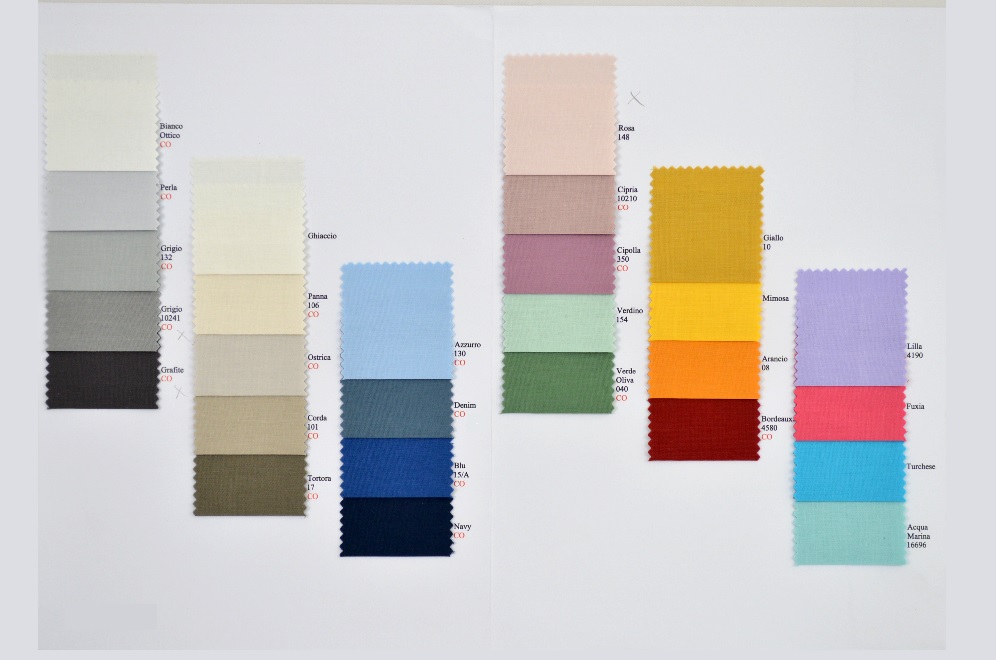| Colore | ACQUA MARINA 16696, ARANCIO 08, AZZURRO 130, Bianco, BLU 15-A, BORDEAUX 4580, Bosco 801, CIPOLLA 350, CIPRIA 10210, CORDA 101, Denim, fuxia, GIALLO 10, Grafite, GRIGIO 10241, GRIGIO 132, LILLA 4190, MIMOSA, NAVY, Ostrica, PANNA 106, Pavone 901, Perla, ROSA 148, TORTORA 17, Turchese, VERDE 154, VERDE OLIVA 040 |
