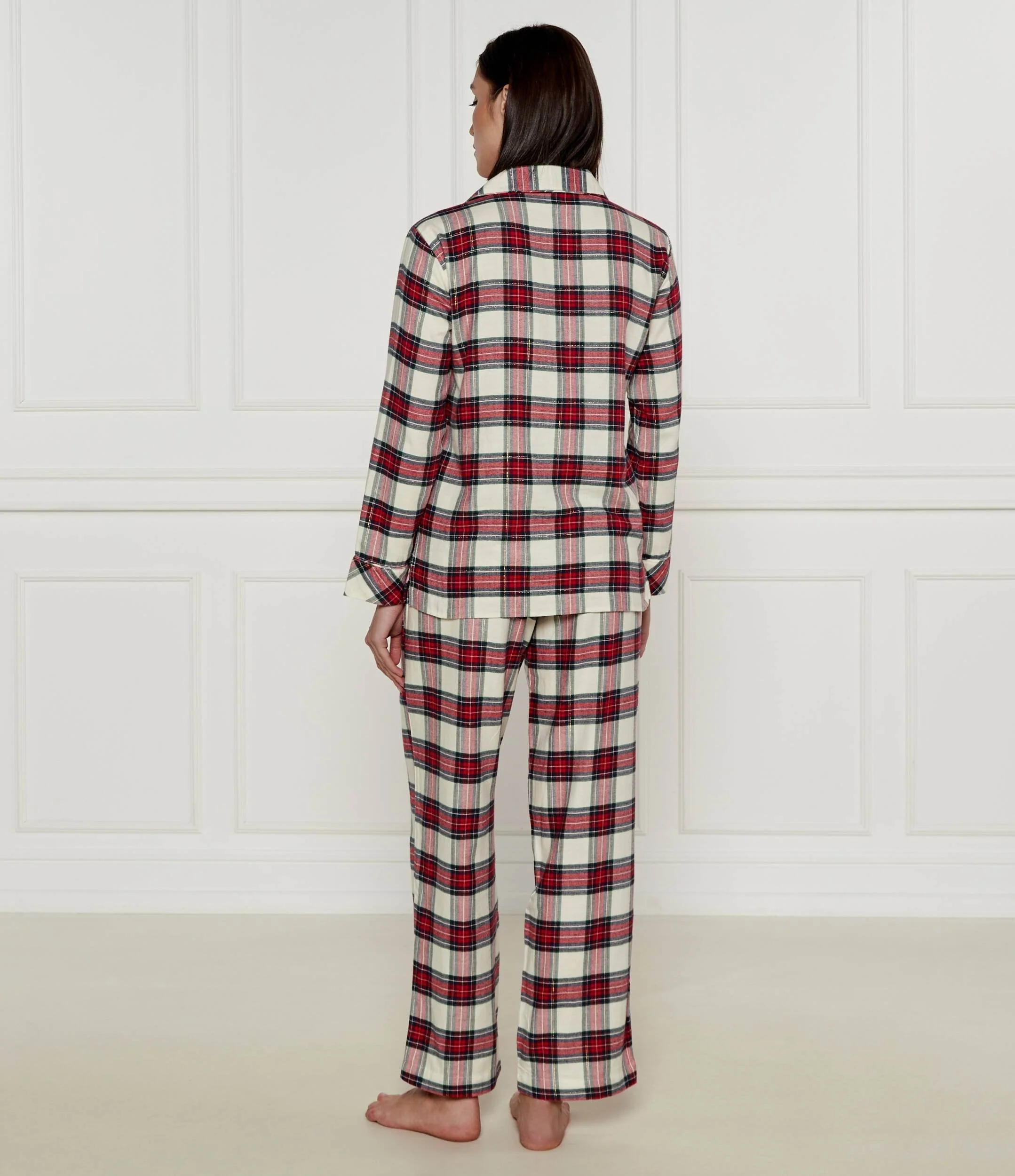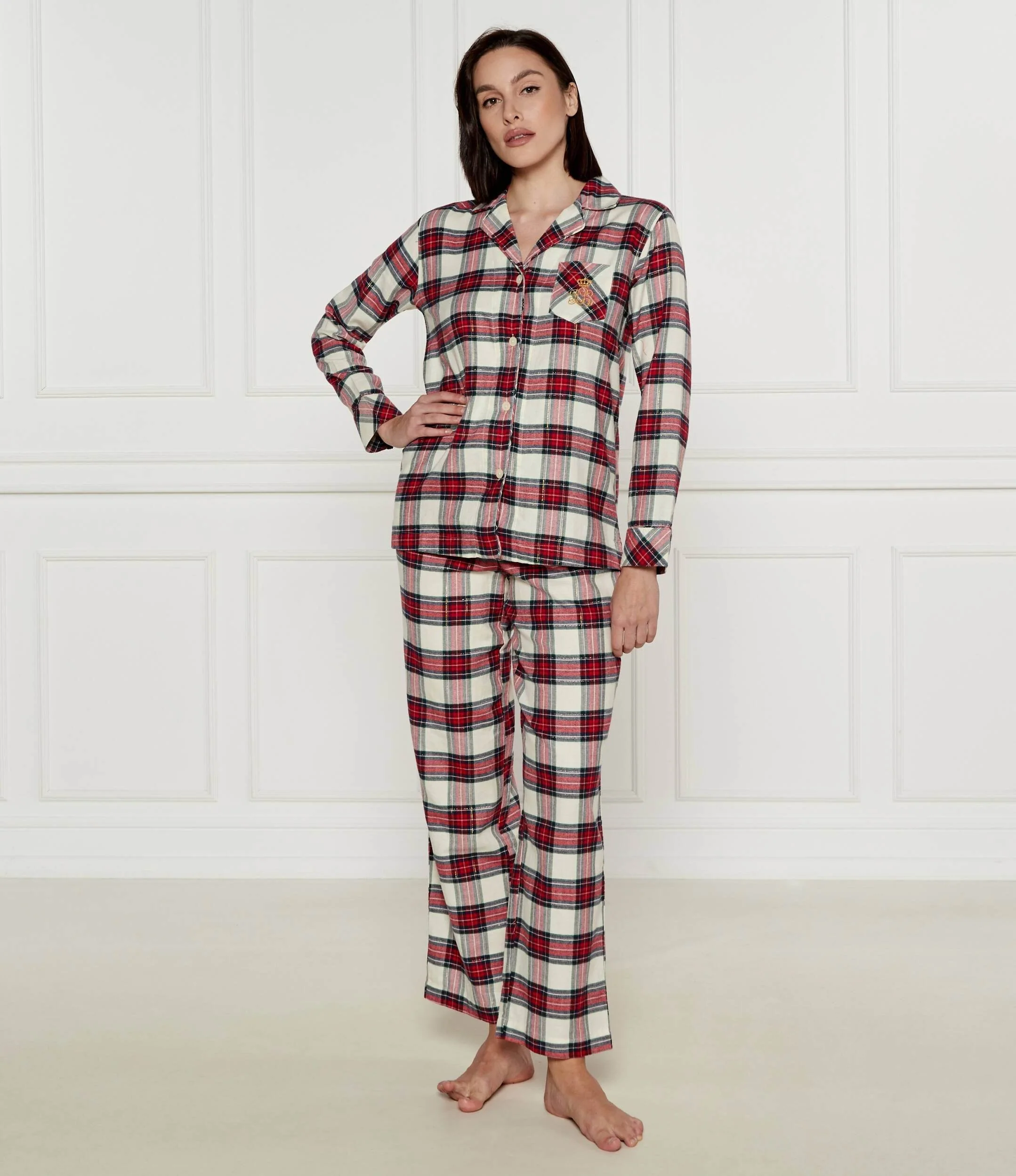 Realizzato in morbida flanella di cotone, questo classico set pigiama Ralph Lauren รจ caratterizzato da un motivo a quadri integrale e dallโiconico logo ricamato sulla tasca sul petto, rendendolo la scelta ideale per le sere invernali. La camicia presenta un colletto a revers, abbottonatura frontale e maniche lunghe rifinite con piping sulle cuciture dei polsini. I pantaloni sono dotati di fascia elastica in vita e di due pratiche tasche laterali oblique. Lunghezza interna gamba 76,2 cm. Composizione: 100% cotone. Lavabile in lavatrice. La modella รจ alta 178 cm e indossa la taglia S.