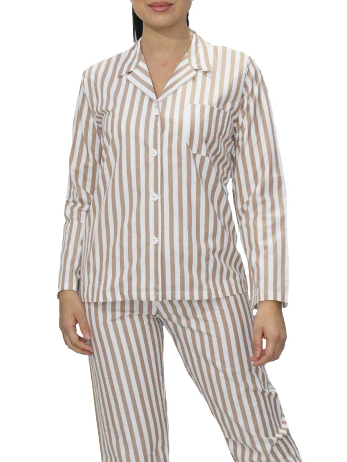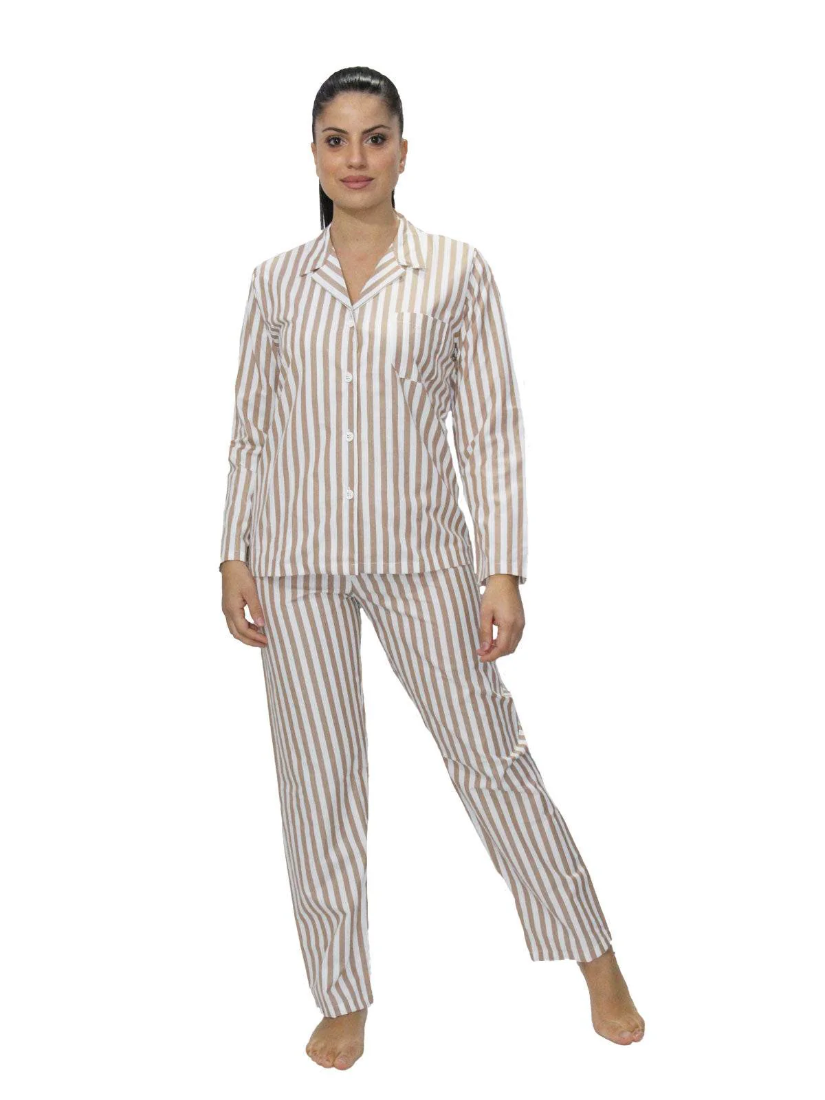 Pigiama da donna aperto con maniche lunghe, in elegante tonalitร beige, firmato Crispo, modello Miele Riga. Questo capo, dal design classico e raffinato, presenta una fantasia a righe sottili che aggiunge un tocco di stile senza rinunciare alla semplicitร . La chiusura frontale con bottoni garantisce praticitร e una vestibilitร confortevole, ideale per chi ama il comfort unito a unโestetica curata. Realizzato in tessuto leggero e traspirante, รจ perfetto per tutte le stagioni.