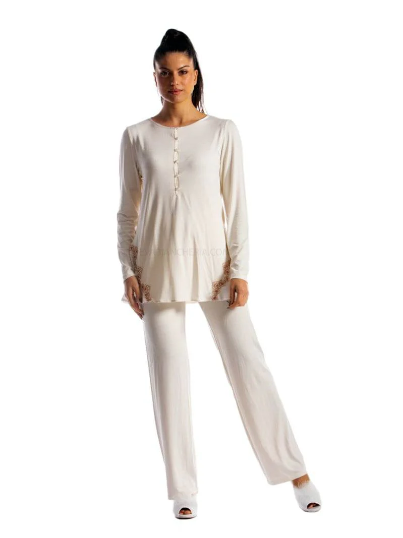Elegante pigiama da donna in morbida viscosa invernale. Modello serafino con applicazioni in pizzo