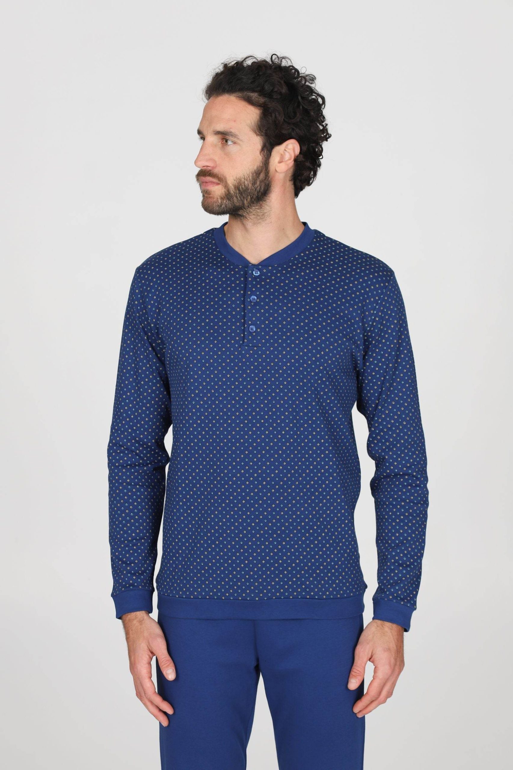 Eleganza e comfort si incontrano in questo pigiama serafino realizzato in interlock di puro cotone, pensato per le serate piรน tranquille a casa. La maglia presenta uno scollo serafino con bottoni che unisce praticitร e stile, mentre la raffinata fantasia a rombi bluette ad alta definizione aggiunge un tocco sofisticato al tuo abbigliamento notturno.
