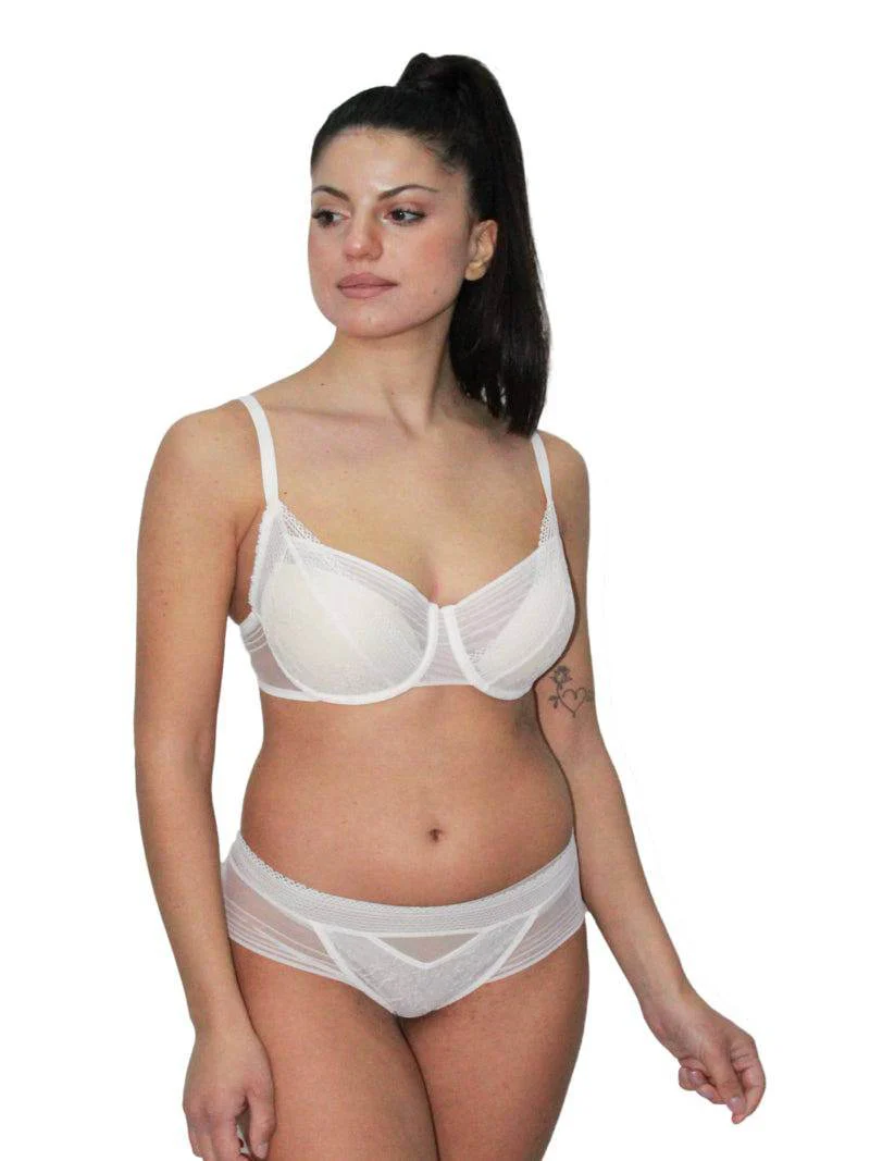 vestibilitร ed รจ decorato in tinta unita nella colorazione naturale del colore talco. Il reggiseno a