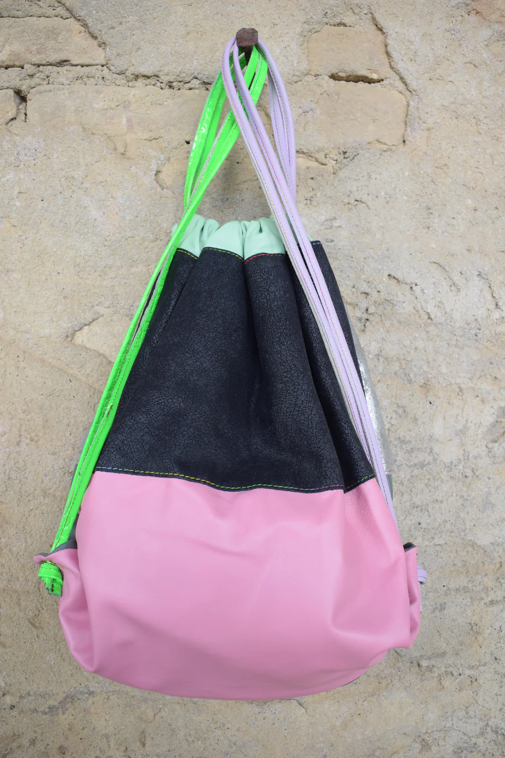 Libera e contemporanea, ROT-NEST รจ la sacca in pelle patchwork pensata per chi vuole uno stile pratico e distintivo. Morbida, capiente e leggera, si porta con disinvoltura sulle spalle grazie ai lacci. Ogni creazione รจ un pezzo unico, frutto di lavorazione artigianale.