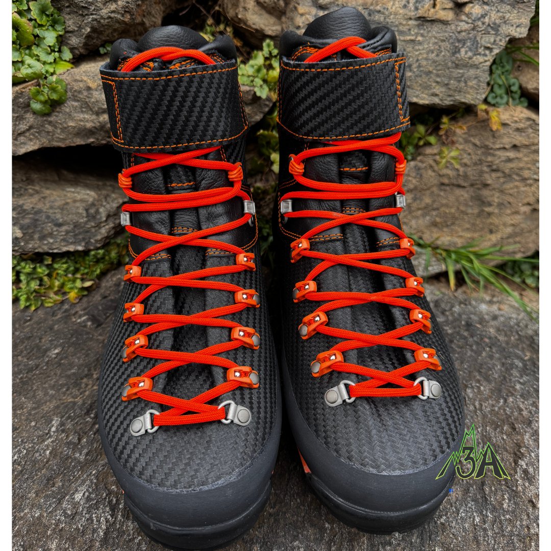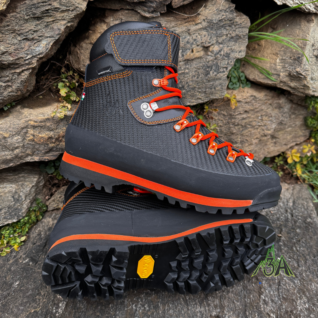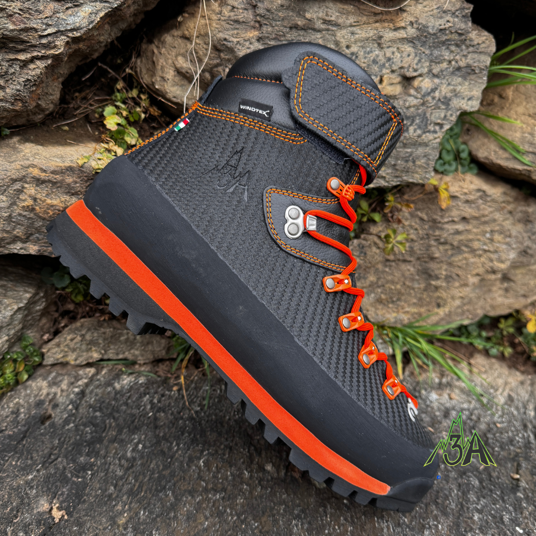 crosta Carbon impermeabile garantito scarpone resistente antigraffio suola Vibram antiscivolo ganci a carrucolina antiruggine pezzo unico di pelle fascione di protezione gancio blocca caviglia suola autopulente alta visibilitร fascia blocca stringa pelle 3mm made in Italy 823 gr