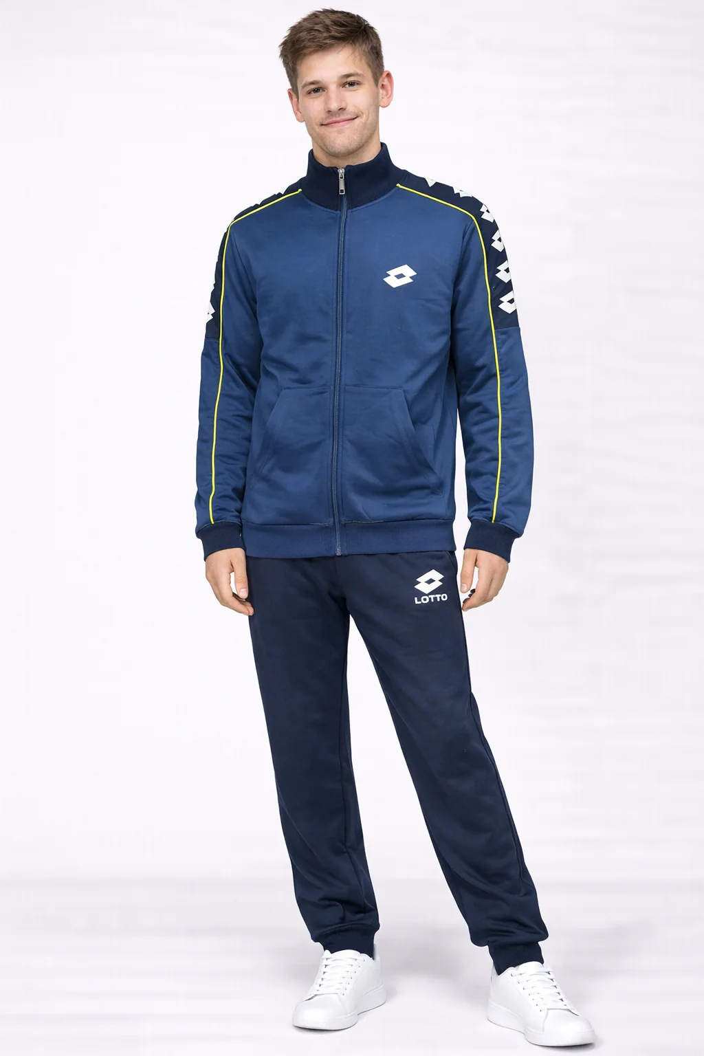 Comoda e pratica tuta sottouomo firmata Lotto, realizzata in caldo cotone, ideale per le stagioni piรน fresche e perfetta sia come pigiama che come completo casa.