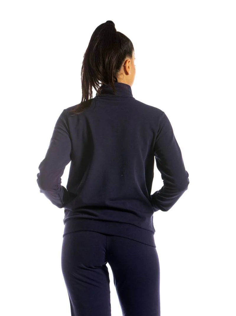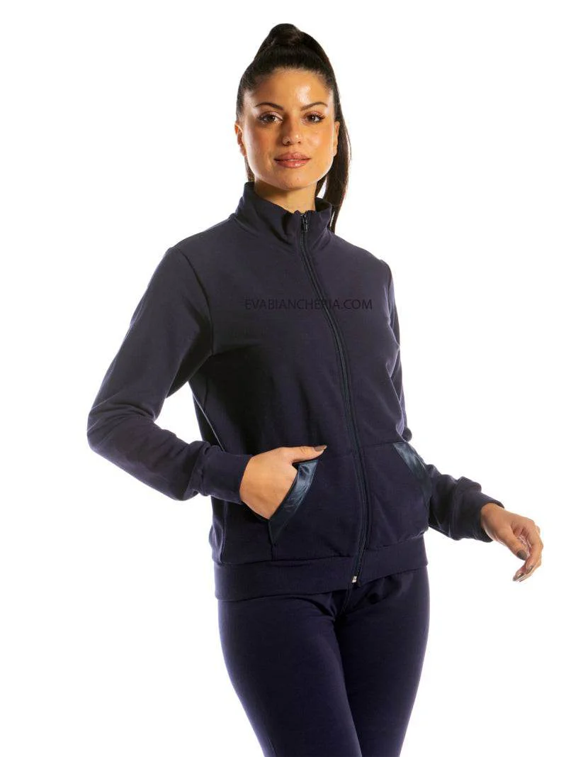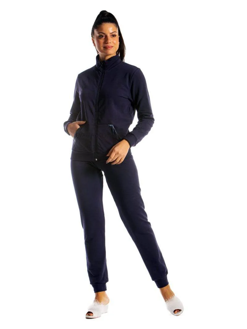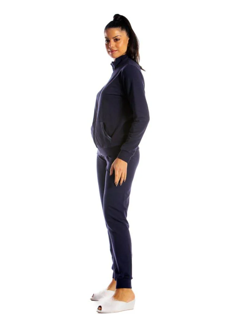 Tuta da donna in cotone felpato, modello con colo e zip in tinta unita e polsini alle caviglie.