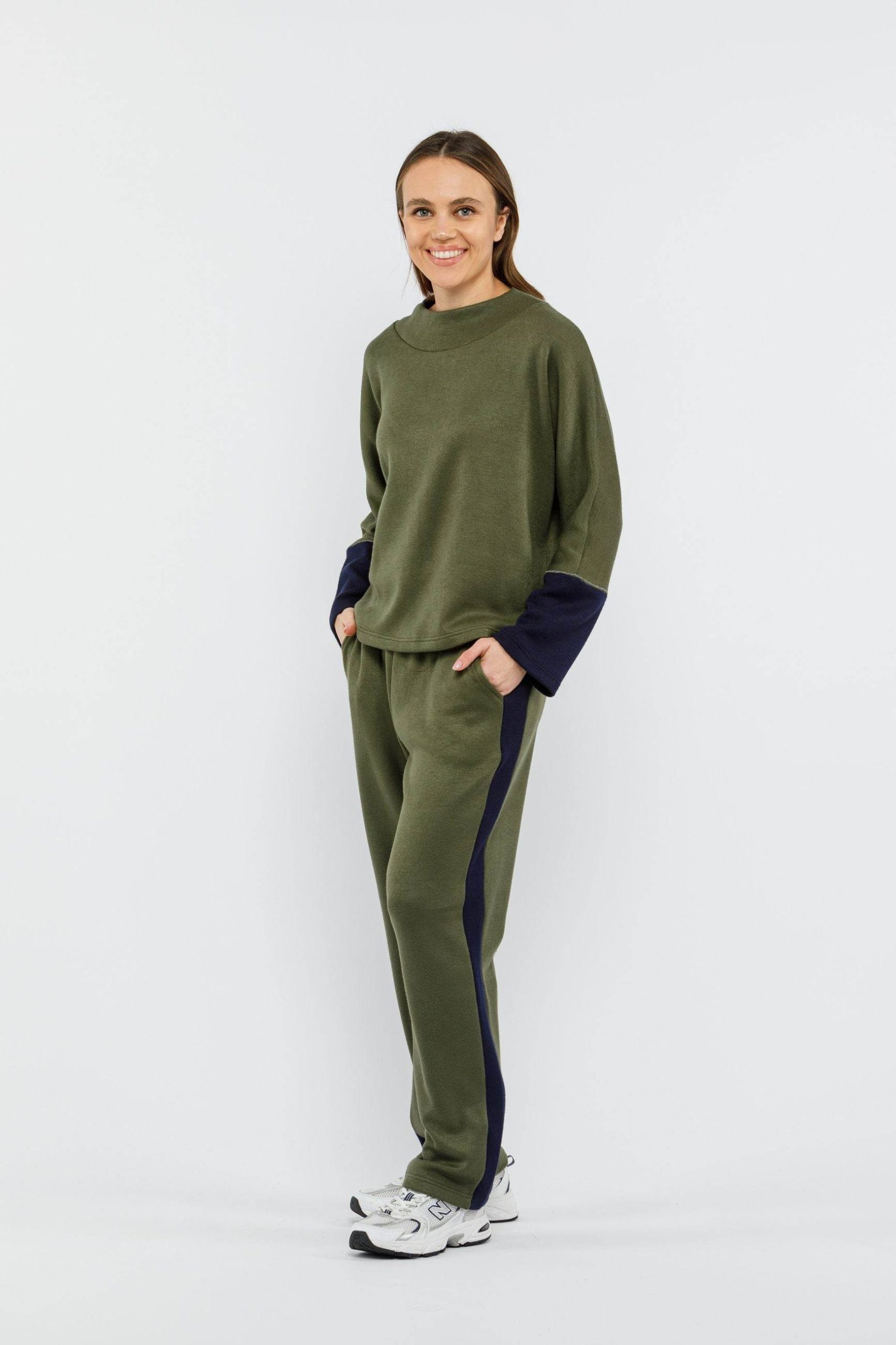 La maglia girocollo presenta polsini a contrasto, che aggiungono un tocco di carattere al capo. Il pantalone con riga laterale a contrasto slancia la figura e regala un look dinamico e contemporaneo.