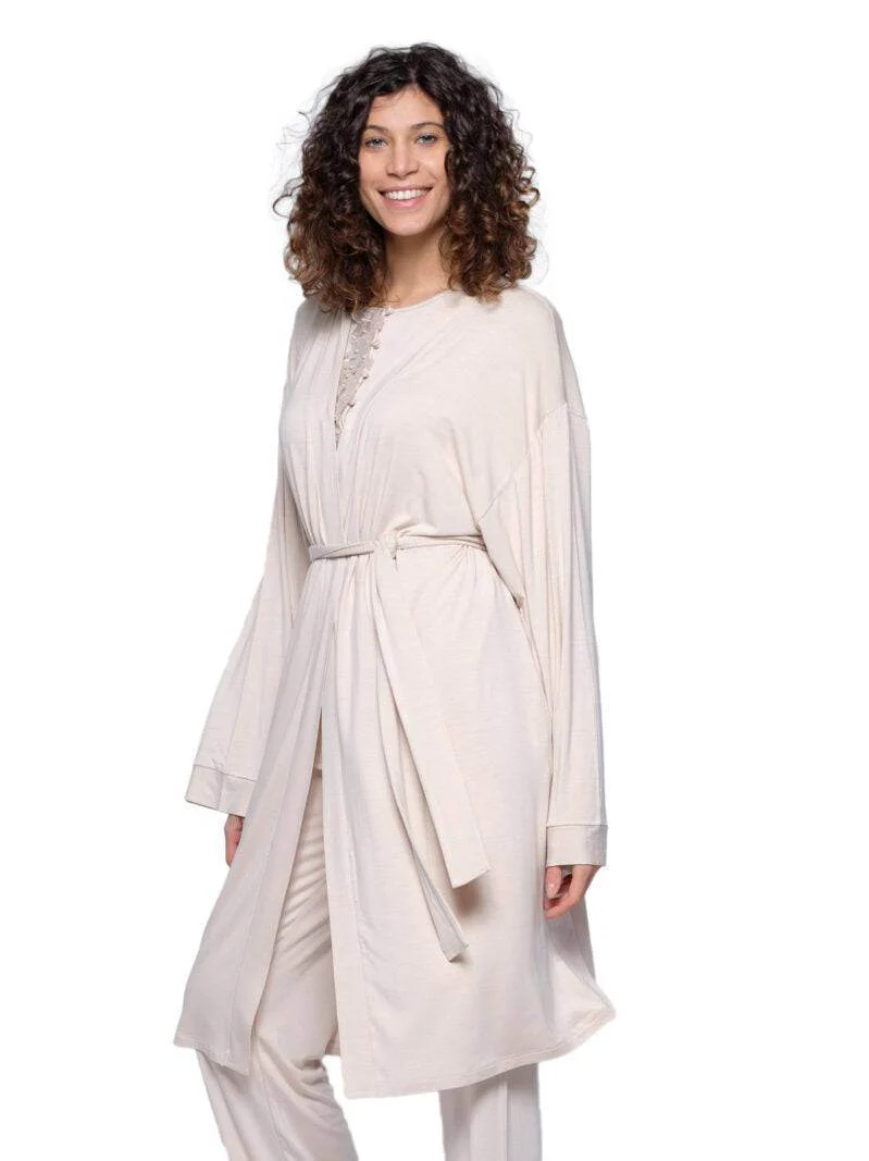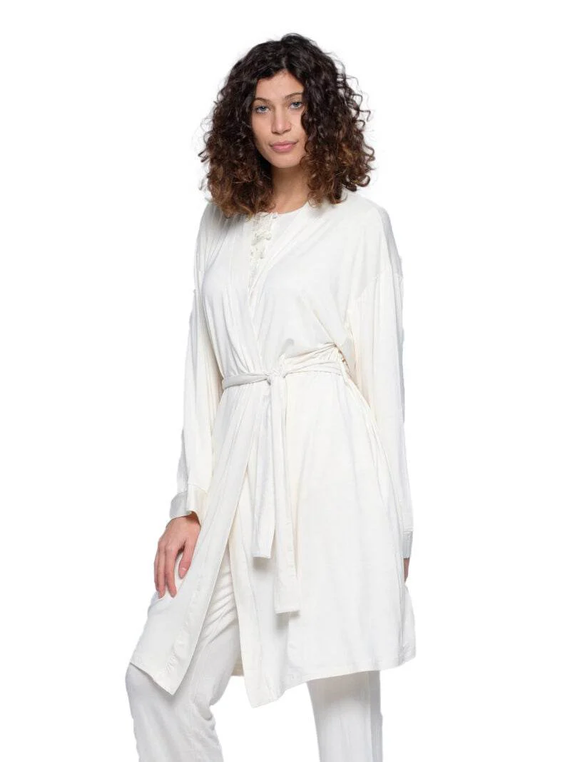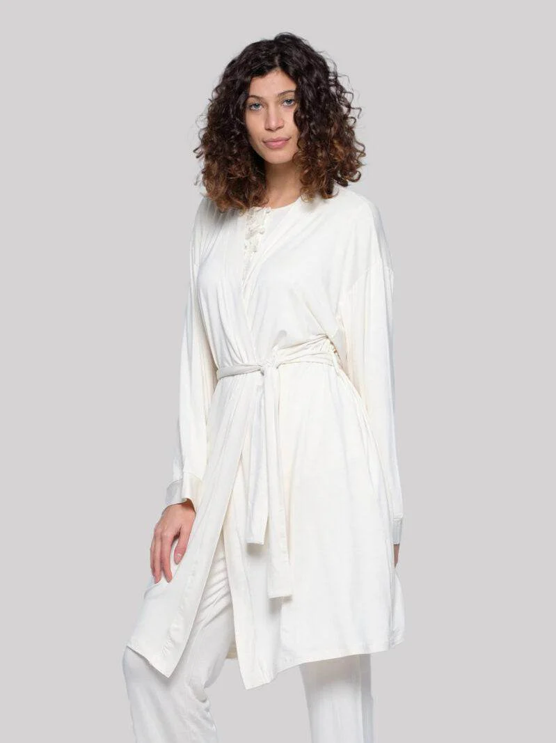 Vestaglia kimono in tinta unita in jersey di viscosa. Questo kimono si abbina perfettamente ai pigiami e alle camicie da notte di Pepita. ร un capo morbido e comodo per stare in casa, ideale per la clinica e per lโallattamento.