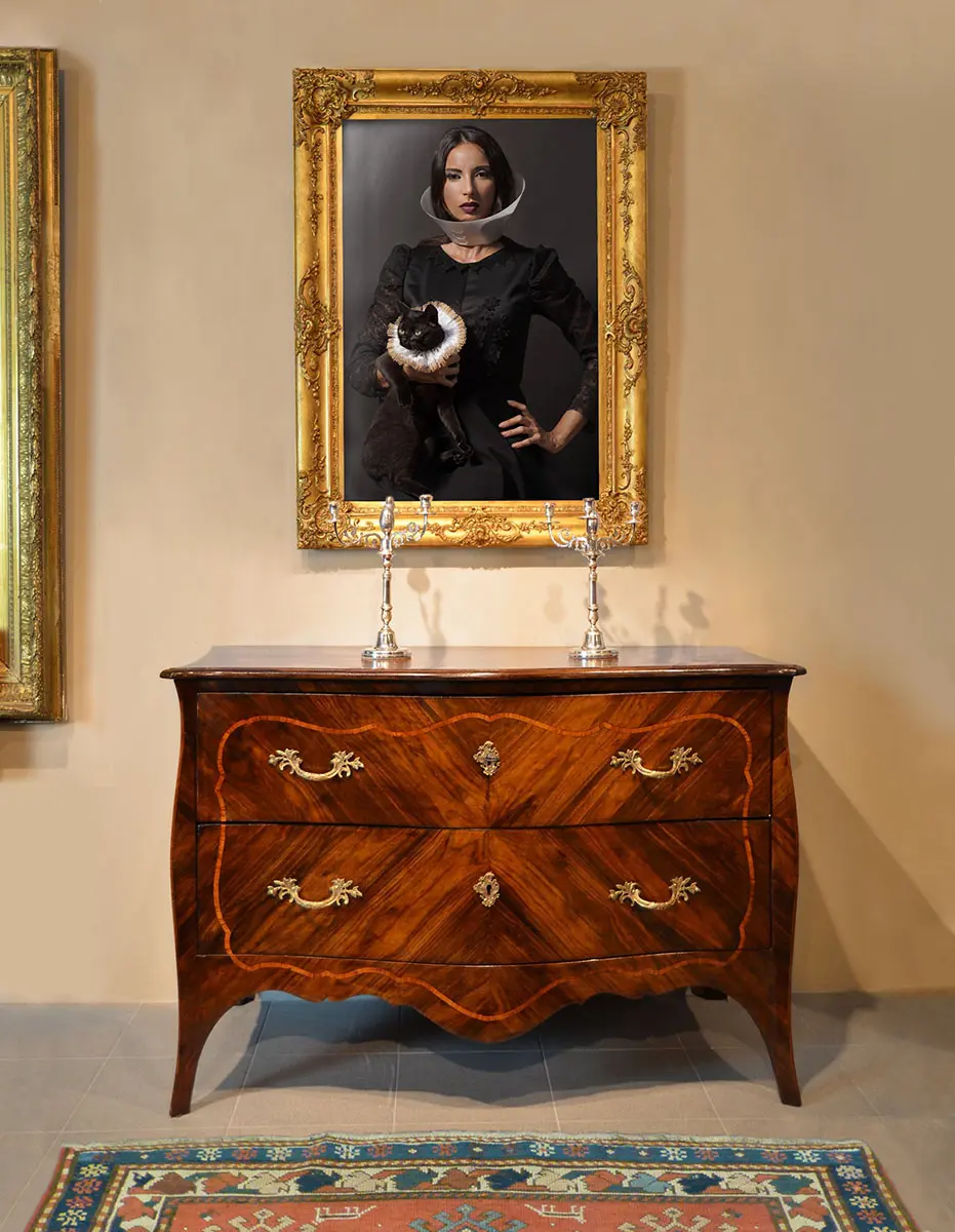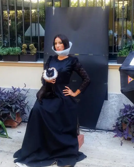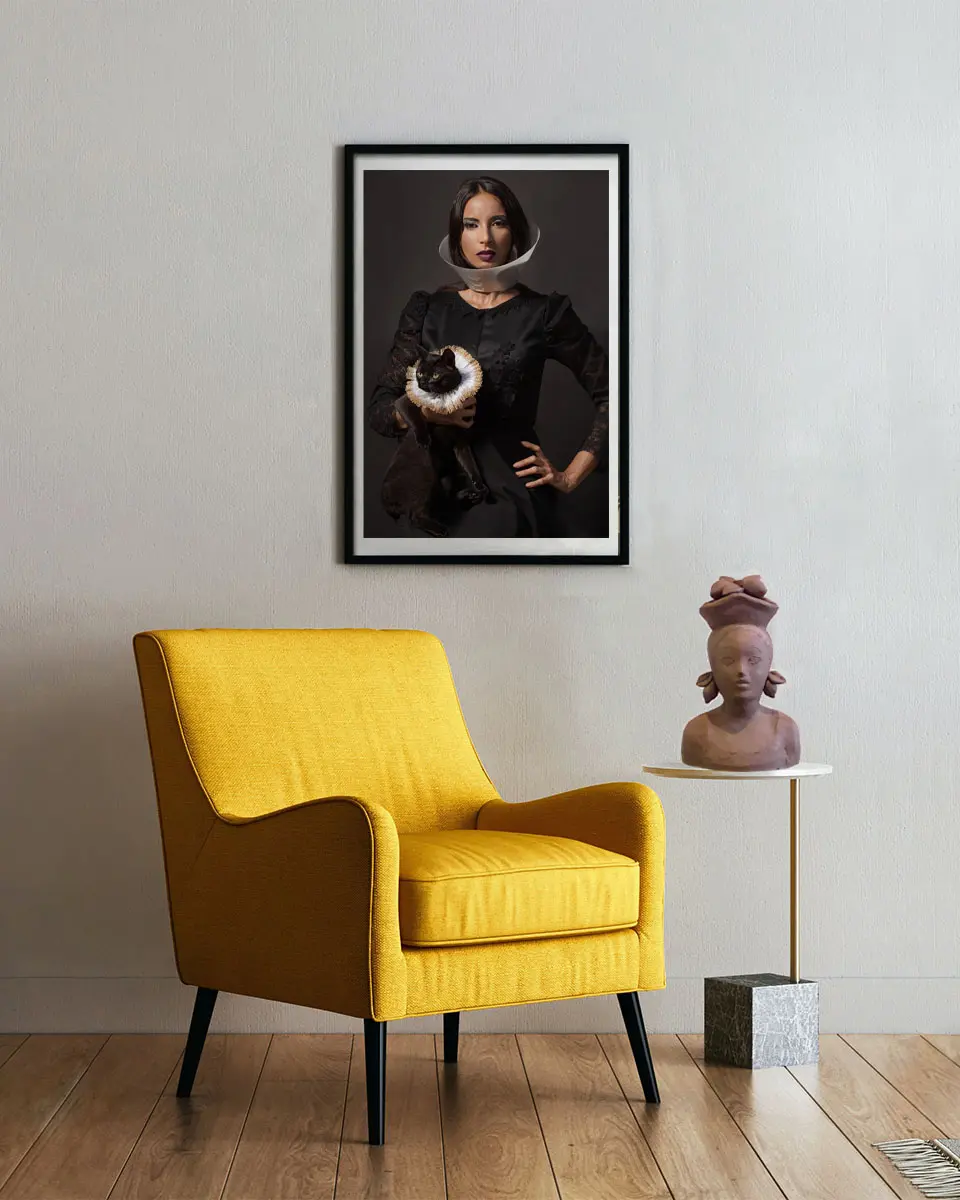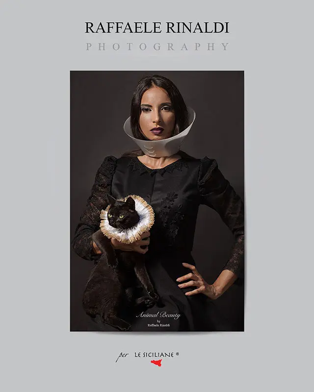 Raffaele Rinaldi “Who is the Animal”? Questa fotografia appartenente alla serie “Animal Beauty”, in cui gli animali si accostano alla modella in modi surreali. Lo scambio dei collari, fra animale ed essere umano, presuppone una riflessione sulla vera natura umana e sulla  sua presunta superiorità morale. E’ un tema più volte ripreso dall’artista, che nega in modo netto l’antropocentrismo, la centralità dell’uomo nell’universo. Il gatto nero, gentilmente concesso da un’amica, si è reso disponibile giusto per due scatti di pochi secondi, prima di scappare in giardino inferocito e sparire per due giorni. Paradossalmente è stato l’animale più difficile da fotografare…